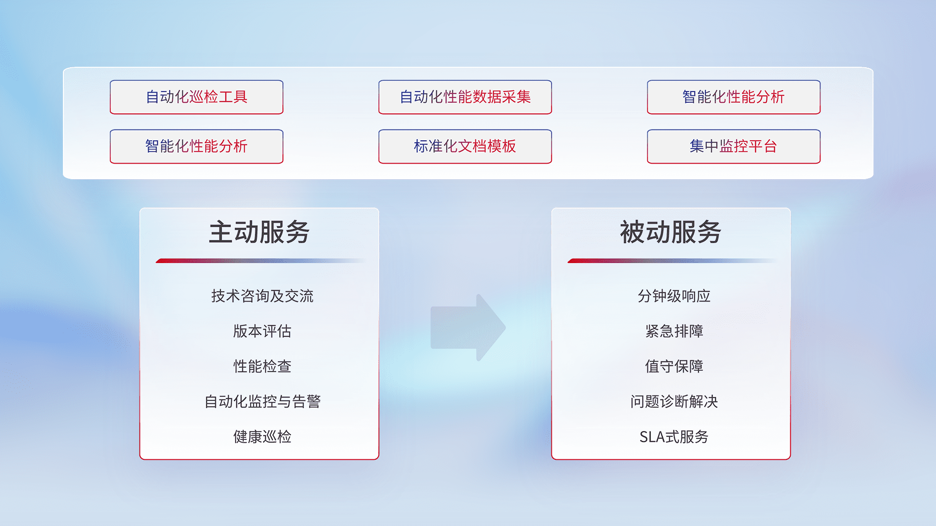 智能化工具和标准化文档,,保障服务质量,,,,提供主动服务(包含技术咨询、、、、版本评估、、性能检查、、、、自动化监控与告警、、健康巡检)和被动服务包含(分钟级响应、、、紧急排障、、、值守保障、、、问题诊断解决、、SLA服务)。。。